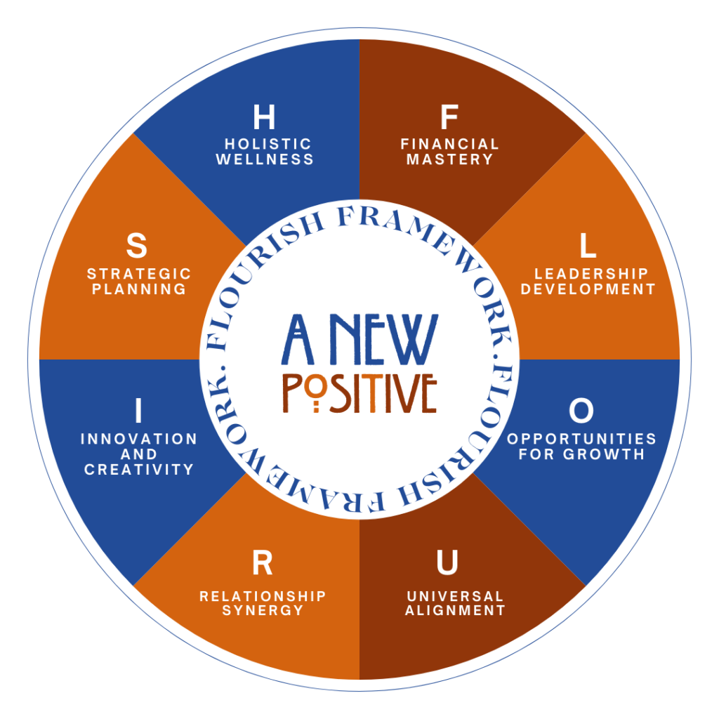 We believe true success comes from flourishing in every area of life. A New Positive is rooted in our proprietary FLOURISH Framework—a powerful model designed to help you achieve Financial Mastery, Develop Leadership Skills, Grow from Opportunities, Align with Universal Truths, Create Relationship Synergy, Ignite Your Creativity, Engage in Strategic Planning, and Enhance Your Holistic Wellness.